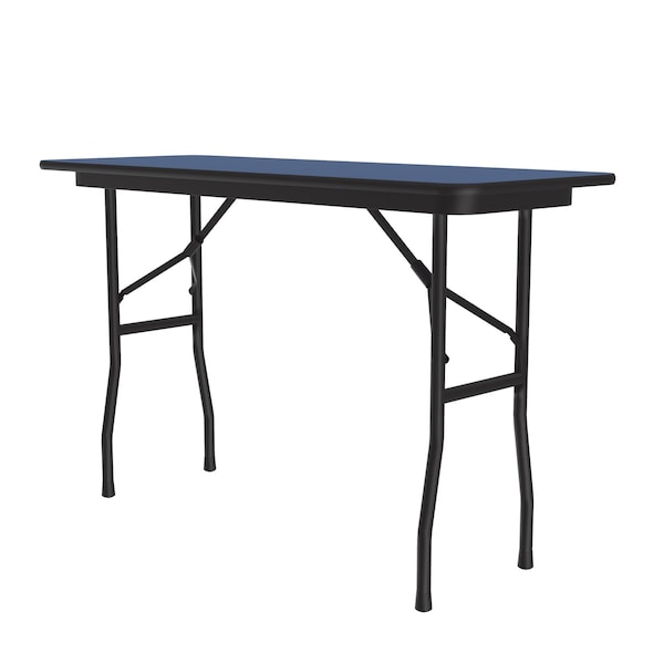 Correll Commercial Duty Top Folding Tables. 18"x48" Rectangular Blue high pressure laminate surface, resists scratches and stains and has a hard, flat writing surface. Heavy Duty 5/8" thick high density particle board core with backer sheet to prevent warping from moisture from entering the table. Heavy duty 1" Steel legs and one piece Strong steel frame / apron supports the top. Automatic lock open folding legs helps to prevents accidents. Black frame and T molding. Mar Proof plastic foot caps to help protect floors and T molding edge protects the table as well as your walls. Heavy Duty construction, Ideal in public and commercial spaces including schools and places of worship. You Can Count On Correll: Correll was established in 1969 and has been in business for over 50 years. With our outstanding Standing Customer Service, innovative new product lines, and the largest selection of Folding Tables available from any manufacturer, now, more than ever, you can count on Correll.