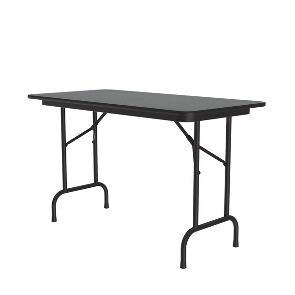 Correll Commercial Duty Top Folding Tables. 24"x48" Rectangular Montana Granite high pressure laminate surface, resists scratches and stains and has a hard, flat writing surface. Heavy Duty 5/8" thick high density particle board core with backer sheet to prevent warping from moisture from entering the table. Heavy duty 1" Steel legs and one piece Strong steel frame / apron supports the top. Automatic lock open folding legs helps to prevents accidents. Black frame and T molding. Mar Proof plastic foot caps to help protect floors and T molding edge protects the table as well as your walls. Heavy Duty construction, Ideal in public and commercial spaces including schools and places of worship. You Can Count On Correll: Correll was established in 1969 and has been in business for over 50 years. With our outstanding Standing Customer Service, innovative new product lines, and the largest selection of Folding Tables available from any manufacturer, now, more than ever, you can count on Correll.