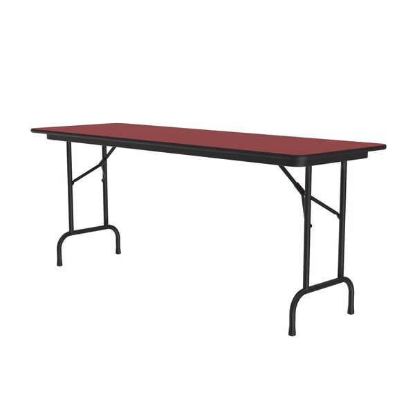 Correll Commercial Duty Top Folding Tables. 24"x96" Rectangular Red high pressure laminate surface, resists scratches and stains and has a hard, flat writing surface. Heavy Duty 5/8" thick high density particle board core with backer sheet to prevent warping from moisture from entering the table. Heavy duty 1" Steel legs and one piece Strong steel frame / apron supports the top. Automatic lock open folding legs helps to prevents accidents. Black frame and T molding. Mar Proof plastic foot caps to help protect floors and T molding edge protects the table as well as your walls. Heavy Duty construction, Ideal in public and commercial spaces including schools and places of worship. You Can Count On Correll: Correll was established in 1969 and has been in business for over 50 years. With our outstanding Standing Customer Service, innovative new product lines, and the largest selection of Folding Tables available from any manufacturer, now, more than ever, you can count on Correll.