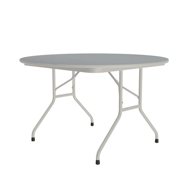 Correll Commercial Duty Top Folding Tables. 48" Round Gray Granite Thermal Fused laminate surface, resists scratches and stains and has a hard, flat writing surface. Thermal Fused Laminate (TFL) is a resin infused laminate not glued on like high pressure laminate, it is fused to the board using a heat treatment process. 3/4" thick top is sealed on both sides preventing moisture from entering the table and causing warping. Heavy duty 1" Steel legs and one piece Strong steel frame / apron supports the top. Automatic lock open folding legs helps to prevents accidents. Gray frame and T molding. Mar Proof plastic foot caps to help protect floors and T molding edge protects the table as well as your walls. Heavy Duty construction, Ideal in public and commercial spaces including schools and places of worship. You Can Count On Correll: Correll was established in 1969 and has been in business for over 50 years. With our outstanding Standing Customer Service, innovative new product lines, and the largest selection of Folding Tables available from any manufacturer, now, more than ever, you can count on Correll.
