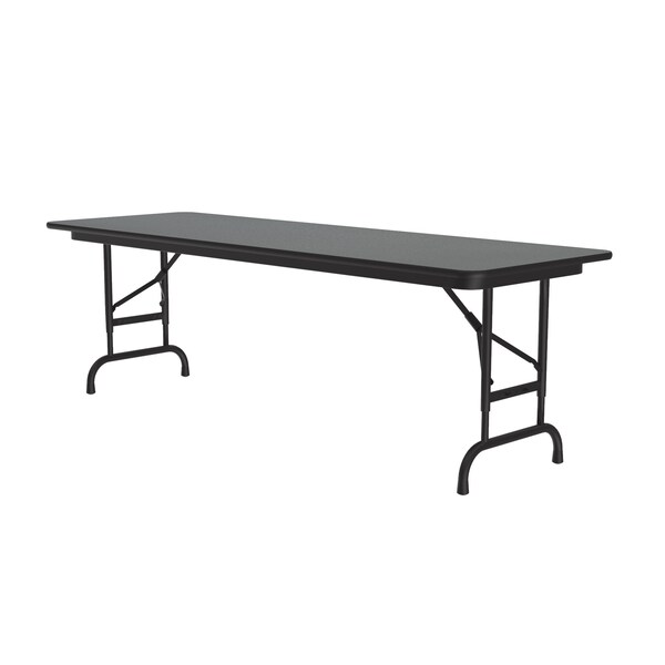 Correll Commercial Duty Height Adjustable Folding Tables. 24"x72" rectangular Montana Granite laminate surface, resists scratches and stains and has a hard, flat writing surface. Table easily adjusts in height from 22" to 32" high in 1" increments. Heavy Duty 5/8" thick high density particle board core with backer sheet to prevent warping from moisture from entering the table. Heavy duty 1" Steel legs and one piece Strong steel frame / apron supports the top. Automatic lock open folding legs helps to prevents accidents. Black steel frame / apron and Black T-molding. Mar Proof plastic foot caps to help protect floors and T molding edge protects the table as well as your walls. Heavy Duty construction, Ideal in public and commercial spaces including schools and places of worship. You Can Count On Correll: Correll was established in 1969 and has been in business for over 50 years. With our outstanding Standing Customer Service, innovative new product lines, and the largest selection of Folding Tables available from any manufacturer, now, more than ever, you can count on Correll.