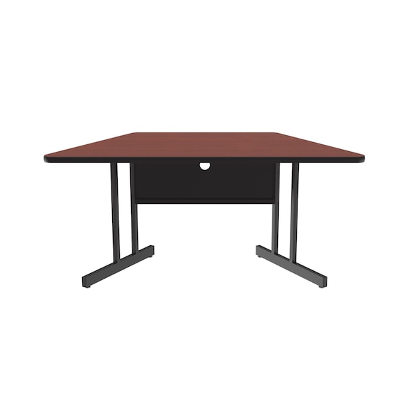Correll Keyboard Height Computer & Training Table. 30"x60" Cherry Trapezoid high Pressure Laminate top. high Pressure Laminate resists scratch's, paint, markers, crayons, and food and juice stains far better than melamine. These workstations are 26" high the perfect Ergonomic Keyboard height. The 1-1/4" thick core with backer sheet helps to prevent warping. They feature Black steel frames and T-Mold edging and sturdy all Steel frames with adjustable leveling guides. The Steel modesty panels with wire management hole and wire trough make for a clean look. YOU CAN COUNT ON CORRELL: Correll was established in 1969 and has been in business for over 50 years. With our outstanding Standing Customer Service, innovative new product lines, and the largest selection of Folding Tables available from any manufacturer, now, more than ever, you can count on Correll.