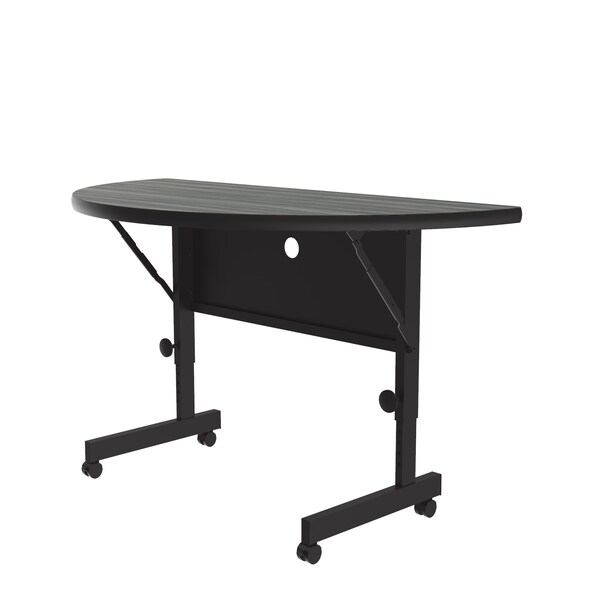 Correll Adjustable Height Deluxe Flip Top Table. Rectangular Shaped. Table dimensions -24"x48" Half Round. Height adjustable from 23" to 31" in 1" increments, Allows the table to be set at 9 different heights including Keyboard Height and Desk Height. 1-1/4" High Pressure Laminate Top The same surface used in kitchen countertops. New England Driftwood. Black steel frame and T-Mold edging. Modesty panel frame with wire management. Tops fold to less than 4" for compact storage. 2 regular and 2 locking casters. Backer sheet on underside of table helps protect against moisture entering the underside of the top causing warping. Includes BOTH easy to use large knobs for fast height adjustments and set screws and wrench for maximum tamper resistance1-1/4" High Pressure Laminate Top offers a hard durable surface. Ideal for demanding environments such as homes, public and commercial spaces including food service, offices, schools and places of worship YOU CAN COUNT ON CORRELL: Correll was established in 1969 and has been in business for over 50 years. With our outstanding Standing Customer Service, innovative new product lines, and the largest selection of Folding Tables available from any manufacturer, now, more than ever, you can count on Correll.