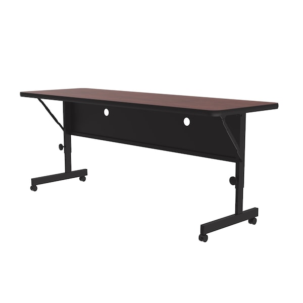 Correll Adjustable Height Deluxe Flip Top Table. Rectangular Shaped. Table dimensions - 24" x 72". Height adjustable from 23" to 31" in 1" increments, Allows the table to be set at 9 different heights including Keyboard Height and Desk Height. 1-1/4" High Pressure Laminate Top The same surface used in kitchen countertops. Mahogany colored Top. Black steel frame and T-Mold edging. Tops fold and nest to less than 4" for compact storage. 2 regular and 2 locking casters. Backer sheet on underside of table helps protect against moisture entering the underside of the top causing warping. Includes BOTH easy to use large knobs for fast height adjustments and set screws and wrench for maximum tamper resistance. 1-1/4" High Pressure Laminate Top offer a hard durable surface. Ideal for demanding environments such as homes, public and commercial spaces including food service, offices, schools and places of worship5 Year Limited warranty against defects in materials and workmanship. YOU CAN COUNT ON CORRELL: