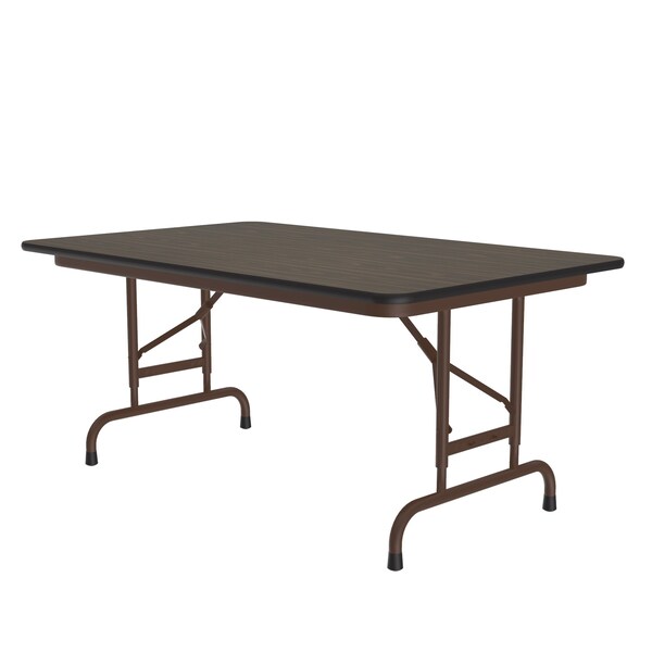 Correll Height adjustable Melamine Top Folding Tables. 30"x48" Rectangular Melamine laminate top, offers a smooth writing surface. Walnut Top is on a 5/8" High Density Particle Board Core for strength and durability. Easily adjusts in height from 22" to 32" high in 1" increments. Strong steel pedestal legs stay open securely with automatic locks. Heavy duty one piece steel frame / apron. Gray Colored T-Mold edging protects the table as well as your walls. Mar-Proof Plastic foot caps protect carpets and floors. Designed for light to moderate duty in your home, office or shop. YOU CAN COUNT ON CORRELL: Correll was established in 1969 and has been in business for over 50 years. With our out Standing Customer Service, innovative new product lines, and the largest selection of Folding Tables available from any manufacturer, now, more than ever, you can count on Correll.. Brown Colored T-Mold edging protects the table as well as your walls. Mar-Proof Plastic foot caps protect carpets and floors. Designed for light to moderate duty in your home, office or shop. YOU CAN COUNT ON CORRELL: Correll was established in 1969 and has been in business for over 50 years. With our out Standing Customer Service, innovative new product lines, and the largest selection of Folding Tables available from any manufacturer, now, more than ever, you can count on Correll..