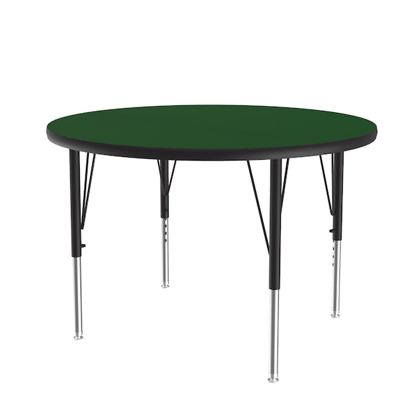 Correll Height Adjustable Activity Table. Table Size is 36" round. Height adjustable from 19" to 29" in 1" increments (perfect for kindergarten to adult) Speedwrench included for fast and secure height adjustments. Green High Pressure Laminate resists scratch's, paint, markers, crayons, and food and juice stains far better than melamine. 1-1/8" High Density particle board core provides strength. Heavy Duty legs include oversize hairpin brace and shouldered set screws for maximum safety. Shoulder on leg set screw provides an extra measure of security even if the legs are not properly tightened. Leg mounting brackets are pre attached with 7 screws plus 3 additional screws in the leg plate. Black T-Mold edging and black and chrome legs. Tables are custom built to order. YOU CAN COUNT ON CORRELL: Correll was established in 1969 and has been in business for over 50 years. With our outstanding Standing Customer Service, innovative new product lines, and the largest selection of Folding Tables available from any manufacturer, now, more than ever, you can count on Correll.