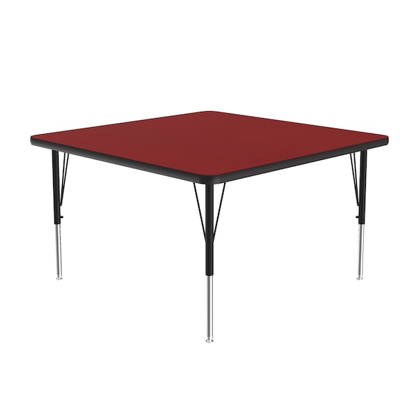 Correll Height Adjustable Activity Table. Table Size is 42" Square. Height adjustable from 19" to 29" in 1" increments (perfect for kindergarten to adult) Speedwrench included for fast and secure height adjustments. Red High Pressure Laminate resists scratch's, paint, markers, crayons, and food and juice stains far better than melamine. 1-1/8" High Density particle board core provides strength. Heavy Duty legs include oversize hairpin brace and shouldered set screws for maximum safety. Shoulder on leg set screw provides an extra measure of security even if the legs are not properly tightened. Leg mounting brackets are pre attached with 7 screws plus 3 additional screws in the leg plate. Black T-Mold edging and black and chrome legs. Tables are custom built to order. YOU CAN COUNT ON CORRELL: Correll was established in 1969 and has been in business for over 50 years. With our outstanding Standing Customer Service, innovative new product lines, and the largest selection of Folding Tables available from any manufacturer, now, more than ever, you can count on Correll.