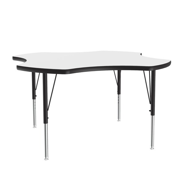 Correll Height Adjustable Activity Table. Table Size is 48" Clover Shaped. Height adjustable from 19" to 29" in 1" increments (perfect for kindergarten to adult) Speedwrench included for fast and secure height adjustments. White High Pressure Laminate resists scratch's, paint, markers, crayons, and food and juice stains far better than melamine. 1-1/8" High Density particle board core provides strength. Heavy Duty legs include oversize hairpin brace and shouldered set screws for maximum safety. Shoulder on leg set screw provides an extra measure of security even if the legs are not properly tightened. Leg mounting brackets are pre attached with 7 screws plus 3 additional screws in the leg plate. Black T-Mold edging and black and chrome legs. Tables are custom built to order. YOU CAN COUNT ON CORRELL: Correll was established in 1969 and has been in business for over 50 years. With our outstanding Standing Customer Service, innovative new product lines, and the largest selection of Folding Tables available from any manufacturer, now, more than ever, you can count on Correll.
