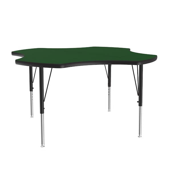 Correll Height Adjustable Activity Table. Table Size is 48" Clover Shaped. Height adjustable from 19" to 29" in 1" increments (perfect for kindergarten to adult) Speedwrench included for fast and secure height adjustments. Green High Pressure Laminate resists scratch's, paint, markers, crayons, and food and juice stains far better than melamine. 1-1/8" High Density particle board core provides strength. Heavy Duty legs include oversize hairpin brace and shouldered set screws for maximum safety. Shoulder on leg set screw provides an extra measure of security even if the legs are not properly tightened. Leg mounting brackets are pre attached with 7 screws plus 3 additional screws in the leg plate. Black T-Mold edging and black and chrome legs. Tables are custom built to order. YOU CAN COUNT ON CORRELL: Correll was established in 1969 and has been in business for over 50 years. With our outstanding Standing Customer Service, innovative new product lines, and the largest selection of Folding Tables available from any manufacturer, now, more than ever, you can count on Correll.