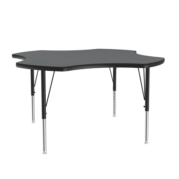 Correll Height Adjustable Activity Table. Table Size is 48" Clover Shaped. Height adjustable from 19" to 29" in 1" increments (perfect for kindergarten to adult) Speedwrench included for fast and secure height adjustments. Montana Granite High Pressure Laminate resists scratch's, paint, markers, crayons, and food and juice stains far better than melamine. 1-1/8" High Density particle board core provides strength. Heavy Duty legs include oversize hairpin brace and shouldered set screws for maximum safety. Shoulder on leg set screw provides an extra measure of security even if the legs are not properly tightened. Leg mounting brackets are pre attached with 7 screws plus 3 additional screws in the leg plate. Black T-Mold edging and black and chrome legs. Tables are custom built to order. YOU CAN COUNT ON CORRELL: Correll was established in 1969 and has been in business for over 50 years. With our outstanding Standing Customer Service, innovative new product lines, and the largest selection of Folding Tables available from any manufacturer, now, more than ever, you can count on Correll.