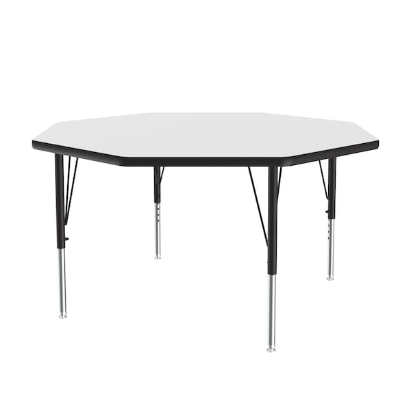 Correll Height Adjustable Activity Table. Table Size is 48" Octagon Shaped. Height adjustable from 19" to 29" in 1" increments (perfect for kindergarten to adult) Speedwrench included for fast and secure height adjustments. White High Pressure Laminate resists scratch's, paint, markers, crayons, and food and juice stains far better than melamine. 1-1/8" High Density particle board core provides strength. Heavy Duty legs include oversize hairpin brace and shouldered set screws for maximum safety. Shoulder on leg set screw provides an extra measure of security even if the legs are not properly tightened. Leg mounting brackets are pre attached with 7 screws plus 3 additional screws in the leg plate. Black T-Mold edging and black and chrome legs. Tables are custom built to order. YOU CAN COUNT ON CORRELL: Correll was established in 1969 and has been in business for over 50 years. With our outstanding Standing Customer Service, innovative new product lines, and the largest selection of Folding Tables available from any manufacturer, now, more than ever, you can count on Correll.
