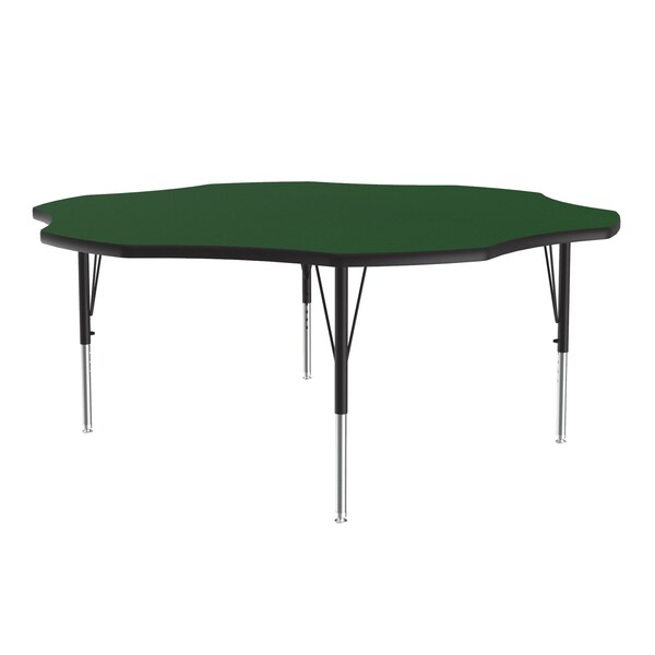 Correll Height Adjustable Activity Table. Table Size is 60" Flower Shaped. Height adjustable from 19" to 29" in 1" increments (perfect for kindergarten to adult) Speedwrench included for fast and secure height adjustments. Green High Pressure Laminate resists scratch's, paint, markers, crayons, and food and juice stains far better than melamine. 1-1/8" High Density particle board core provides strength. Heavy Duty legs include oversize hairpin brace and shouldered set screws for maximum safety. Shoulder on leg set screw provides an extra measure of security even if the legs are not properly tightened. Leg mounting brackets are pre attached with 7 screws plus 3 additional screws in the leg plate. Black T-Mold edging and black and chrome legs. Tables are custom built to order. YOU CAN COUNT ON CORRELL: Correll was established in 1969 and has been in business for over 50 years. With our outstanding Standing Customer Service, innovative new product lines, and the largest selection of Folding Tables available from any manufacturer, now, more than ever, you can count on Correll.