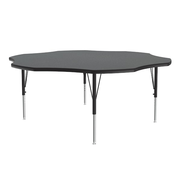 Correll Height Adjustable Activity Table. Table Size is 60" Flower Shaped. Height adjustable from 19" to 29" in 1" increments (perfect for kindergarten to adult) Speedwrench included for fast and secure height adjustments. Montana Granite High Pressure Laminate resists scratch's, paint, markers, crayons, and food and juice stains far better than melamine. 1-1/8" High Density particle board core provides strength. Heavy Duty legs include oversize hairpin brace and shouldered set screws for maximum safety. Shoulder on leg set screw provides an extra measure of security even if the legs are not properly tightened. Leg mounting brackets are pre attached with 7 screws plus 3 additional screws in the leg plate. Black T-Mold edging and black and chrome legs. Tables are custom built to order. YOU CAN COUNT ON CORRELL: Correll was established in 1969 and has been in business for over 50 years. With our outstanding Standing Customer Service, innovative new product lines, and the largest selection of Folding Tables available from any manufacturer, now, more than ever, you can count on Correll.
