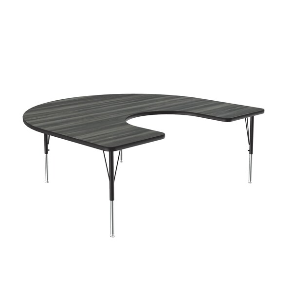 Correll Height Adjustable Activity Table. Table Size is 60"x66" Horseshoe Shaped. Height adjustable from 19" to 29" in 1" increments (perfect for kindergarten to adult) Speedwrench included for fast and secure height adjustments. New England Driftwood High Pressure Laminate resists scratch's, paint, markers, crayons, and food and juice stains far better than melamine. 1-1/8" High Density particle board core provides strength. Heavy Duty legs include oversize hairpin brace and shouldered set screws for maximum safety. Shoulder on leg set screw provides an extra measure of security even if the legs are not properly tightened. Leg mounting brackets are pre attached with 7 screws plus 3 additional screws in the leg plate. Black T-Mold edging and black and chrome legs. Tables are custom built to order. YOU CAN COUNT ON CORRELL: Correll was established in 1969 and has been in business for over 50 years. With our outstanding Standing Customer Service, innovative new product lines, and the largest selection of Folding Tables available from any manufacturer, now, more than ever, you can count on Correll.