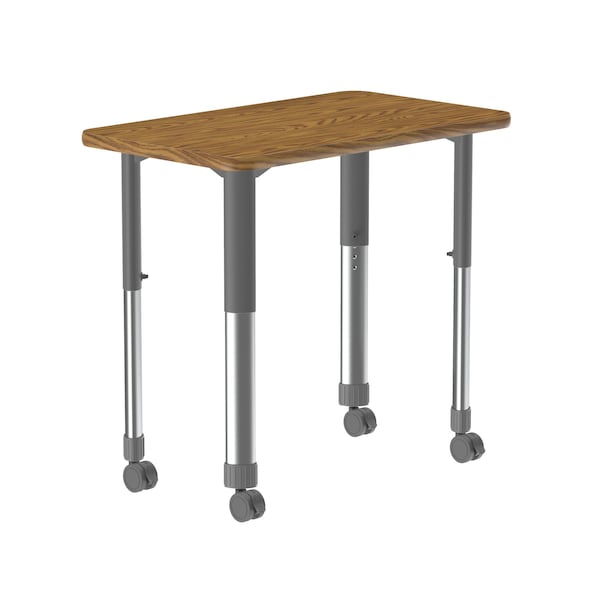 Correll Adjustable Height Collaborative Desk. Medium Oak 23"x33" Rectangular shaped top. HPL Laminate resists scratch's, paint, markers, crayons, and food and juice stains far better than melamine. Gray adjustable height legs can be set from 25” to 35” in 1” increments and includes Hex Wrench for fast height adjustments. 4 locking castors for easy mobility. Backer sheet on underside of table helps in preventing moisture from entering the table and causing warping. Correll helps you create a modern creative transformable workspace. Strong steel frame and walnut T-Mold edging to protect the table as well as your walls. Heavy Duty yet portable for easy storage. Ideal for demanding environments. YOU CAN COUNT ON CORRELL: Correll was established in 1969 and has been in business for over 50 years. With our out Standing Customer Service, innovative new product lines, and the largest selection of Folding Tables available from any manufacturer, now, more than ever, you can count on Correll.