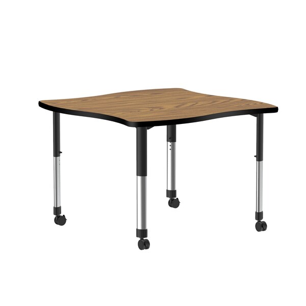 Correll Adjustable Height Collaborative Desk. Medium Oak 23"x33" Swerve shaped top. HPL Laminate resists scratch's, paint, markers, crayons, and food and juice stains far better than melamine. Black adjustable height legs can be set from 25” to 35” in 1” increments and includes Hex Wrench for fast height adjustments. 4 locking castors for easy mobility. Backer sheet on underside of table helps in preventing moisture from entering the table and causing warping. Correll helps you create a modern creative transformable workspace. Strong steel frame and Medium Oak T-Mold edging to protect the table as well as your walls. Heavy Duty yet portable for easy storage. Ideal for demanding environments. YOU CAN COUNT ON CORRELL: Correll was established in 1969 and has been in business for over 50 years. With our out Standing Customer Service, innovative new product lines, and the largest selection of Folding Tables available from any manufacturer, now, more than ever, you can count on Correll.