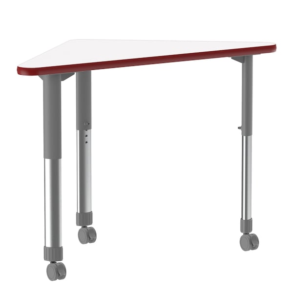 Correll Adjustable Height Collaborative Desk. White dry erase / markerboard 23"x33" Wing shaped top encourages creativity and collaboration. HPL Laminate resists scratch's, paint, markers, crayons, and food and juice stains far better than melamine. Gray adjustable height legs can be set from 25” to 35” in 1” increments and includes Hex Wrench for fast height adjustments. 4 locking castors for easy mobility. Backer sheet on underside of table helps in preventing moisture from entering the table and causing warping. Correll helps you create a modern creative transformable workspace. Strong steel frame and Red T-Mold edging to protect the table as well as your walls. Heavy Duty yet portable for easy storage. Ideal for demanding environments. YOU CAN COUNT ON CORRELL: Correll was established in 1969 and has been in business for over 50 years. With our out Standing Customer Service, innovative new product lines, and the largest selection of Folding Tables available from any manufacturer, now, more than ever, you can count on Correll.