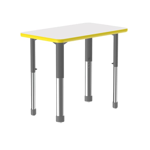 Correll Adjustable Height Collaborative Desk. White dry erase / markerboard 23"x33" Rectangular shaped top encourages creativity and collaboration. HPL Laminate resists scratch's, paint, markers, crayons, and food and juice stains far better than melamine. Gray adjustable height legs can be set from 25” to 35” in 1” increments and includes Hex Wrench for fast height adjustments. Backer sheet on underside of table helps in preventing moisture from entering the table and causing warping. Correll helps you create a modern creative transformable workspace. Strong steel frame and yellow T-Mold edging to protect the table as well as your walls. Heavy Duty yet portable for easy storage. Ideal for demanding environments. YOU CAN COUNT ON CORRELL: Correll was established in 1969 and has been in business for over 50 years. With our out Standing Customer Service, innovative new product lines, and the largest selection of Folding Tables available from any manufacturer, now, more than ever, you can count on Correll.