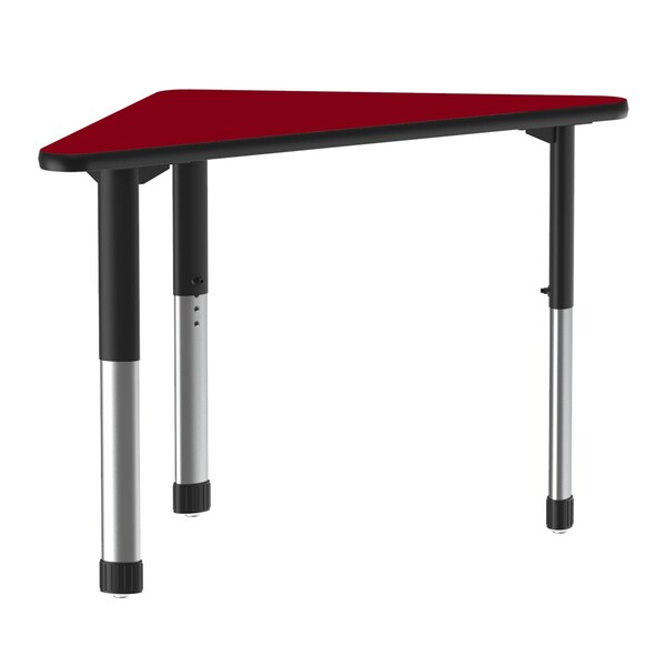 Correll Adjustable Height Collaborative Desk. Red 23"x33" Wing shaped top. HPL Laminate resists scratch's, paint, markers, crayons, and food and juice stains far better than melamine. Black adjustable height legs can be set from 25” to 35” in 1” increments and includes Hex Wrench for fast height adjustments. Backer sheet on underside of table helps in preventing moisture from entering the table and causing warping. Correll helps you create a modern creative transformable workspace. Strong steel frame and Black T-Mold edging to protect the table as well as your walls. Heavy Duty yet portable for easy storage. Ideal for demanding environments. YOU CAN COUNT ON CORRELL: Correll was established in 1969 and has been in business for over 50 years. With our out Standing Customer Service, innovative new product lines, and the largest selection of Folding Tables available from any manufacturer, now, more than ever, you can count on Correll.