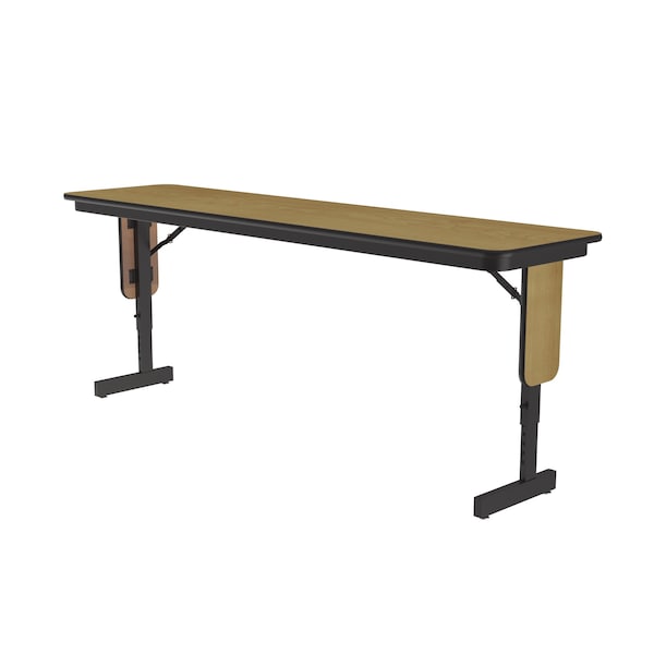 Correll Panel Leg Folding Classroom Training and Seminar Tables. Easily adjusts in height from 22" to 30" in 1" increments. 18"x96" Fusion Maple high pressure laminate surface, resists scratches and stains and has a hard, flat writing surface. Heavy Duty 3/4" thick high density particle board core with backer sheet that helps prevent warping from moisture entering from the underside of the table. Steel offset legs. Unique Knife lock folding legs makes the underneath completely open for maximum leg room and comfort. Stays open securely with automatic lock open legs. Black T-Mold edging protects the table and your walls. Nylon guides on legs helps protect floors and carpets. Classy Panel Leg design. Heavy Duty construction Ideal in public and commercial spaces including schools and places of worship. YOU CAN COUNT ON CORRELL: Correll was established in 1969 and has been in business for over 50 years. With our outstanding Standing Customer Service, innovative new product lines, and the largest selection of Folding Tables available from any manufacturer, now, more than ever, you can count on Correll.
