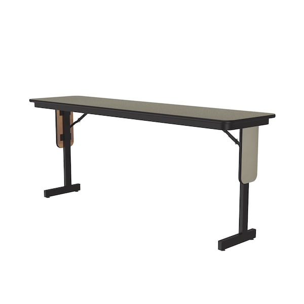 Correll Panel Leg Folding Classroom Training and Seminar Tables. 18"x72" Savannah Sand high pressure laminate surface, resists scratches and stains and has a hard, flat writing surface. Heavy Duty 3/4" thick high density particle board with backer sheet that helps prevent warping from moisture entering from the underside of the table. Steel offset legs. Unique Knife lock folding legs makes the underneath completely open for maximum leg room and comfort. Stays open securely with automatic lock open legs. Black T-Mold edging protects the table and your walls. Nylon guides on legs helps protect floors and carpets. Classy Panel Leg design. Heavy Duty construction Ideal in public and commercial spaces including schools and places of worship. YOU CAN COUNT ON CORRELL: Correll was established in 1969 and has been in business for over 50 years. With our outstanding Standing Customer Service, innovative new product lines, and the largest selection of Folding Tables available from any manufacturer, now, more than ever, you can count on Correll.