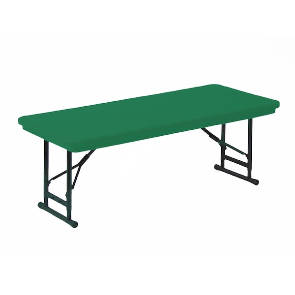Correll Heavy Duty Blow Molded Short Folding Tables. Short version easily adjusts in height from 17" to 27" high in 1" increments. 30"x72" Green Blow-Molded one piece top. Light weight water-proof blow molded plastic designed to virtually eliminate top deflection. Color goes all the through, wont scratch or wear off and resists stains and damage and is virtually indestructible. Steel pedestal legs and strong integrated welded steel frame provides the maximum in strength and durability. Stays open securely with automatic lock open legs. Mar-Proof Plastic foot caps protect carpets and floors. Heavy Duty construction Ideal in public and commercial spaces including schools and places of worship where top will be exposed to foods, crayons, markers, paint, chemicals and other stains. Ideal for use with our T3072 Flat Stack or T282 Edge Stack Table Trucks. Accepts 1-1/4" skirt clips. YOU CAN COUNT ON CORRELL: Correll was established in 1969 and has been in business for over 50 years. With our out Standing Customer Service, innovative new product lines, and the largest selection of Folding Tables available from any manufacturer, now, more than ever, you can count on Correll.