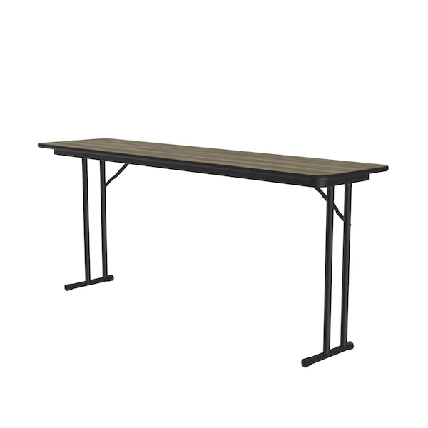 Correll High Pressure Laminate Folding Seminar Table with Off-Set Leg. Built for the harsh demands of Commercial use. Standard 29" high table. 18"x72" Rectangular Colonial Hickory high pressure laminate Top. Laminate surface resists scratches and stains and offers a hard, flat surface. Top also features a Backer sheet on underside of table that helps protect against moisture entering the underside of the table causing warping. Knife-Lock folding mechanism attached to the back leg makes the underneath completely open for maximum leg space. Black T-Mold edging protects your walls and the table top. The table also features a Heavy one piece black steel Frame. YOU CAN COUNT ON CORRELL: Correll was established in 1969 and has been in business for over 50 years. With our out Standing Customer Service, innovative new product lines, and the largest selection of Folding Tables available from any manufacturer, now, more than ever, you can count on Correll.