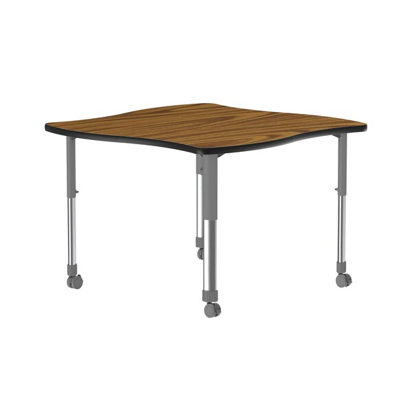 Correll Adjustable Height Collaborative Desk. Medium Oak 42" X 42" Swerve Thermal Fused Laminate top resists scratches, dents, paint, markers, crayons, and food and juice stains. Thermal Fused Laminate (TFL) is a resin infused laminate not glued on like high pressure laminate, it is fused to the board using a heat treatment process. Gray/Chrome adjustable height legs can be set from 25” to 35” in 1” increments and includes Hex Wrench for fast height adjustments. Mobile with 4 locking castors for easy mobility. Black T-Mold edging to protect the table as well as your walls. Heavy Duty yet portable for easy storage. Ideal for demanding environments. YOU CAN COUNT ON CORRELL: Correll was established in 1969 and has been in business for over 50 years. With our out Standing Customer Service, innovative new product lines, and the largest selection of Folding Tables available from any manufacturer, now, more than ever, you can count on Correll.