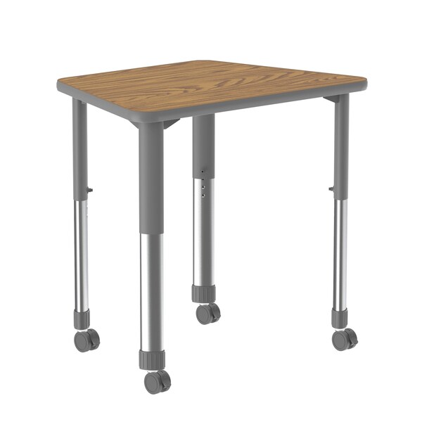 Correll Adjustable Height Collaborative Desk. Medium Oak 23"x33" Trapezoid Thermal Fused Laminate top resists scratches, dents, paint, markers, crayons, and food and juice stains. Thermal Fused Laminate (TFL) is a resin infused laminate not glued on like high pressure laminate, it is fused to the board using a heat treatment process. Gray/Chrome adjustable height legs can be set from 25” to 35” in 1” increments and includes Hex Wrench for fast height adjustments. Mobile with 4 locking castors for easy mobility. Gray T-Mold edging to protect the table as well as your walls. Heavy Duty yet portable for easy storage. Ideal for demanding environments. YOU CAN COUNT ON CORRELL: Correll was established in 1969 and has been in business for over 50 years. With our out Standing Customer Service, innovative new product lines, and the largest selection of Folding Tables available from any manufacturer, now, more than ever, you can count on Correll.
