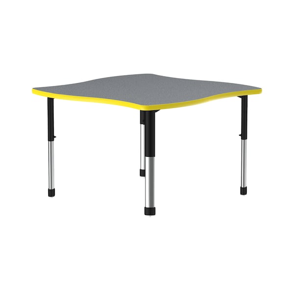 Correll Adjustable Height Collaborative Desk. Gray Granite 42" X 42" Swerve Thermal Fused Laminate top resists scratches, dents, paint, markers, crayons, and food and juice stains. Thermal Fused Laminate (TFL) is a resin infused laminate not glued on like high pressure laminate, it is fused to the board using a heat treatment process. Black/Chrome adjustable height legs can be set from 25” to 35” in 1” increments and includes Hex Wrench for fast height adjustments. Yellow T-Mold edging to protect the table as well as your walls. Heavy Duty yet portable for easy storage. Ideal for demanding environments. YOU CAN COUNT ON CORRELL: Correll was established in 1969 and has been in business for over 50 years. With our out Standing Customer Service, innovative new product lines, and the largest selection of Folding Tables available from any manufacturer, now, more than ever, you can count on Correll.