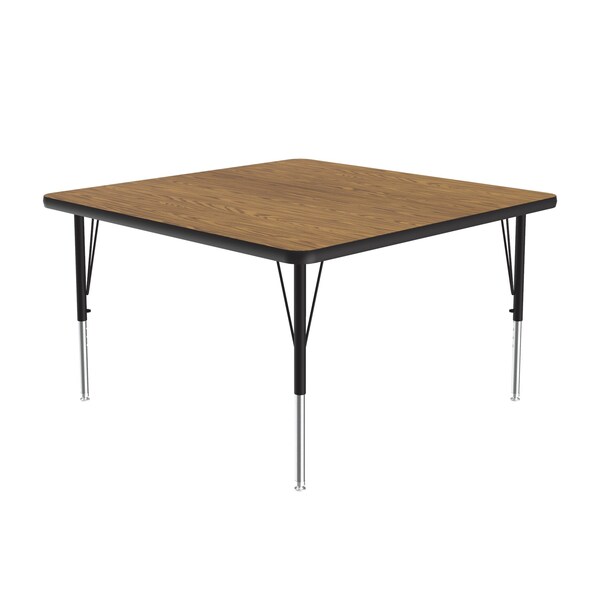 Correll Height Adjustable Activity Table. Thermal Fused Laminate (TFL) is a resin infused laminate not glued on like high pressure laminate, it is fused to the board using a heat treatment process. Table Size is 36" Square. Height adjustable from 19" to 29" in 1" increments (perfect for kindergarten to adult) Speedwrench included for fast and secure height adjustments. Medium Oak top resists scratches, dents, paint, markers, crayons, and food and juice stains far better than melamine. 1 1/4" thick high density top is sealed on both sides preventing moisture from entering the table and causing warping. Heavy Duty legs include oversize hairpin brace and shouldered set screws for maximum safety. Shoulder on leg set screw provides an extra measure of security even if the legs are not properly tightened. Leg mounting brackets are pre attached with 7 screws plus 3 additional screws in the leg plate. Black T-Mold edging and black and chrome legs. Tables are custom built to order. YOU CAN COUNT ON CORRELL: Correll was established in 1969 and has been in business for over 50 years. With our outstanding Standing Customer Service, innovative new product lines, and the largest selection of Folding Tables available from any manufacturer, now, more than ever, you can count on Correll.