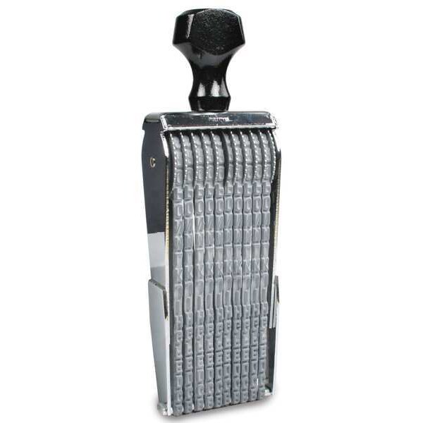 Alphanumeric Stamp, Number of Bands 10, Material Metal, Imprint Area Height 5/16 in, Imprint Area Width 2 3/4 in, Character Height 5/16 in, Font Helvetica Neue & ITC Bookman Std., Overall Height 1 7/8 in, Overall Length 10 1/2 in, Overall Width 3 1/8 in