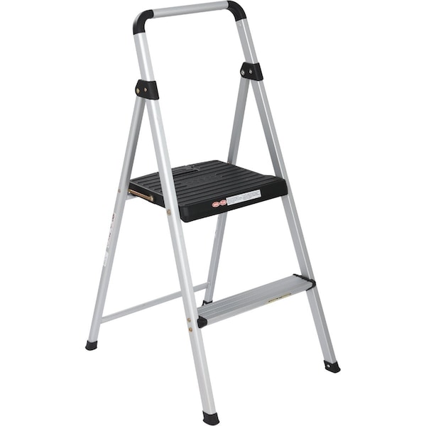 Cosco Lite Solutions folding 2-step step stool is perfect for those miscellaneous jobs around the house and garage. The Lite Solutions step stool folds down for easy storage and also folds flat by lifting the handle. This unit meets ANSI standards for Type II medium household duty rating 225 lb (pound). Large heavy-duty injection molded polypropylene resin steps with ribbed slip-resistant treads. Self-locking fold. Very lightweight aluminum frame. Color: Aluminum/Black. Open dimensions: 39.37 H. x 18.75 W. x 23.25 D.