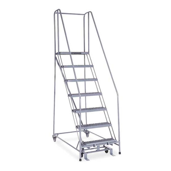 Rolling Ladder, Material Steel, Platform Height 5.8 ft, Handrails Included Yes, Handrail Height 2.5 ft, Overall Height 8.3 ft, Number of Steps 7, Assembled, Load Capacity 450 lb, Step Tread Serrated, Platform Depth 10 in, Platform Width 24 in, Bottom Width 30 in, Base Depth 53 in, Overall Width 30 in, Climbing Angle 59 Degrees , Step Depth 7 in, Step Width 24 in, Ladder Actuation Foot Activated Step Lock, Finish Powder Coated, Color Gray, Standards ANSI, OSHA Compliant, Rear Exit No
