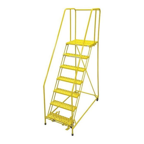 Rolling Ladder, Material Steel, Platform Height 5.8 ft, Handrails Included Yes, Handrail Height 2.5 ft, Overall Height 8.3 ft, Number of Steps 7, Assembled, Load Capacity 450 lb, Step Tread Serrated, Platform Depth 20 in, Platform Width 24 in, Bottom Width 30 in, Base Depth 63 in, Overall Width 30 in, Climbing Angle 59 Degrees , Step Depth 7 in, Step Width 24 in, Ladder Actuation Foot Activated Step Lock, Finish Powder Coated, Color Yellow, Standards ANSI, OSHA Compliant, Rear Exit No