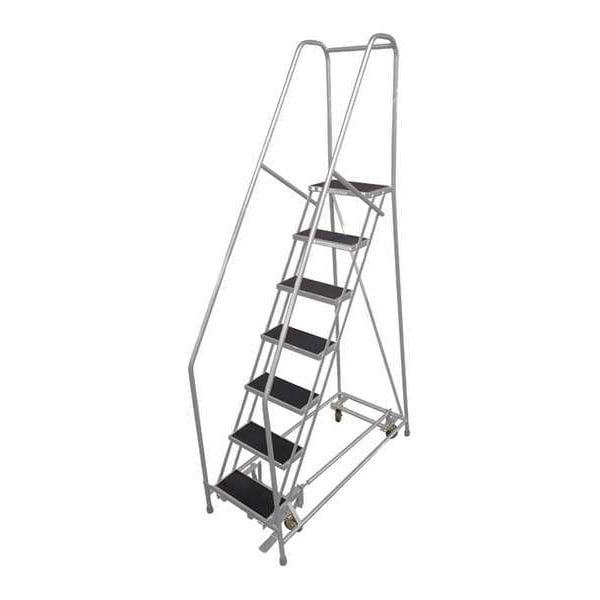 Rolling Ladder, Material Steel, Platform Height 5.8 ft, Handrails Included Yes, Handrail Height 2.5 ft, Overall Height 8.3 ft, Number of Steps 7, Assembled, Load Capacity 450 lb, Step Tread Perforated, Platform Depth 20 in, Platform Width 24 in, Bottom Width 30 in, Base Depth 63 in, Overall Width 30 in, Climbing Angle 59 Degrees , Step Depth 7 in, Step Width 24 in, Ladder Actuation Foot Activated Step Lock, Finish Powder Coated, Color Gray, Standards ANSI, OSHA Compliant, Rear Exit No