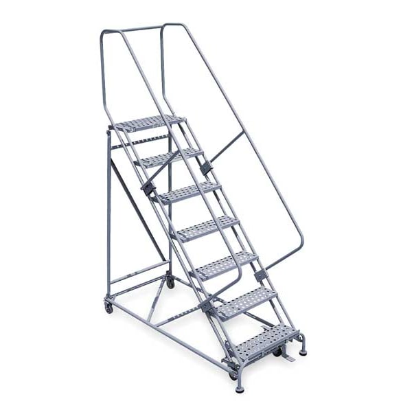 Rolling Ladder, Material Steel, Platform Height 5.8 ft, Handrails Included Yes, Handrail Height 2.5 ft, Overall Height 9.3 ft, Number of Steps 7, Unassembled, Load Capacity 800 lb, Step Tread Expanded Metal, Platform Depth 24 in, Platform Width 24 in, Bottom Width 30 in, Base Depth 81 in, Overall Width 30 in, Climbing Angle 50 Degrees , Step Depth 7 in, Step Width 24 in, Ladder Actuation Foot Activated Step Lock, Finish Powder Coated, Color Gray, Standards ANSI, OSHA Compliant