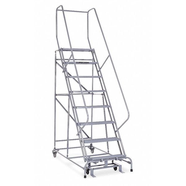 Rolling Ladder, Material Steel, Platform Height 6.7 ft, Handrails Included Yes, Handrail Height 2.5 ft, Overall Height 9.2 ft, Number of Steps 8, Assembled, Load Capacity 450 lb, Step Tread Expanded Metal, Platform Depth 10 in, Platform Width 24 in, Bottom Width 32 in, Base Depth 58 in, Overall Width 32 in, Climbing Angle 59 Degrees , Step Depth 7 in, Step Width 24 in, Ladder Actuation Foot Activated Step Lock, Finish Powder Coated, Color Gray, Standards ANSI, OSHA Compliant, Rear Exit No