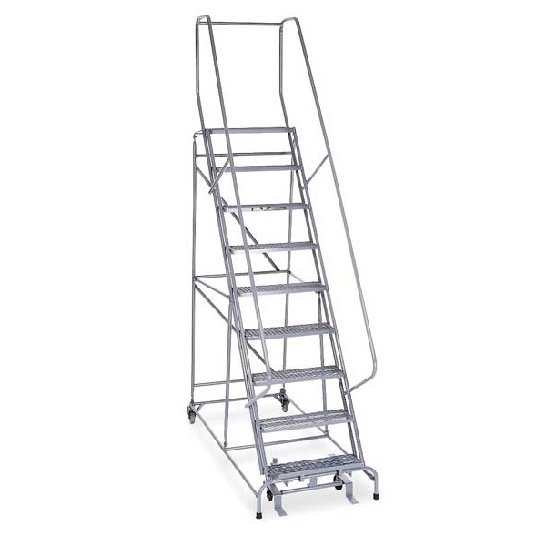 Rolling Ladder, Material Steel, Platform Height 7.5 ft, Handrails Included Yes, Handrail Height 2.5 ft, Overall Height 10 ft, Number of Steps 9, Assembled, Load Capacity 450 lb, Step Tread Antislip Vinyl, Platform Depth 10 in, Platform Width 24 in, Bottom Width 32 in, Base Depth 65 in, Overall Width 32 in, Climbing Angle 59 Degrees , Step Depth 7 in, Step Width 24 in, Ladder Actuation Foot Activated Step Lock, Finish Powder Coated, Color Gray, Standards ANSI, OSHA Compliant, Rear Exit No