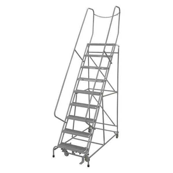 Rolling Ladder, Material Steel, Platform Height 7.5 ft, Handrails Included Yes, Handrail Height 2.5 ft, Overall Height 10 ft, Number of Steps 9, Assembled, Load Capacity 450 lb, Step Tread Serrated, Platform Depth 10 in, Platform Width 24 in, Bottom Width 32 in, Base Depth 120 in, Overall Width 32 in, Climbing Angle 59 Degrees , Step Depth 7 in, Step Width 24 in, Ladder Actuation Foot Activated Step Lock, Finish Powder Coated, Color Gray, Standards ANSI, OSHA Compliant, Rear Exit Yes