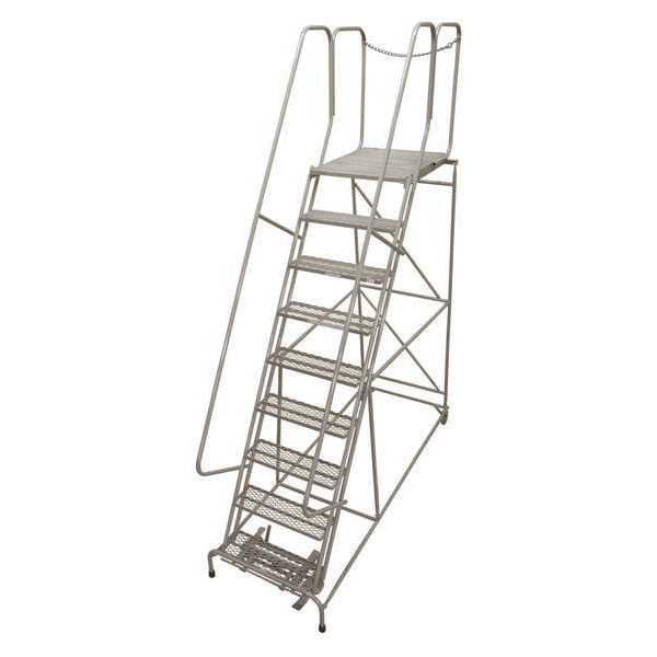 Rolling Ladder, Material Steel, Platform Height 7.5 ft, Handrails Included Yes, Handrail Height 2.5 ft, Overall Height 10 ft, Number of Steps 9, Assembled, Load Capacity 450 lb, Step Tread Serrated, Platform Depth 30 in, Platform Width 24 in, Bottom Width 32 in, Base Depth 120 in, Overall Width 32 in, Climbing Angle 59 Degrees , Step Depth 7 in, Step Width 24 in, Ladder Actuation Foot Activated Step Lock, Finish Powder Coated, Color Gray, Standards ANSI, OSHA Compliant, Rear Exit Yes