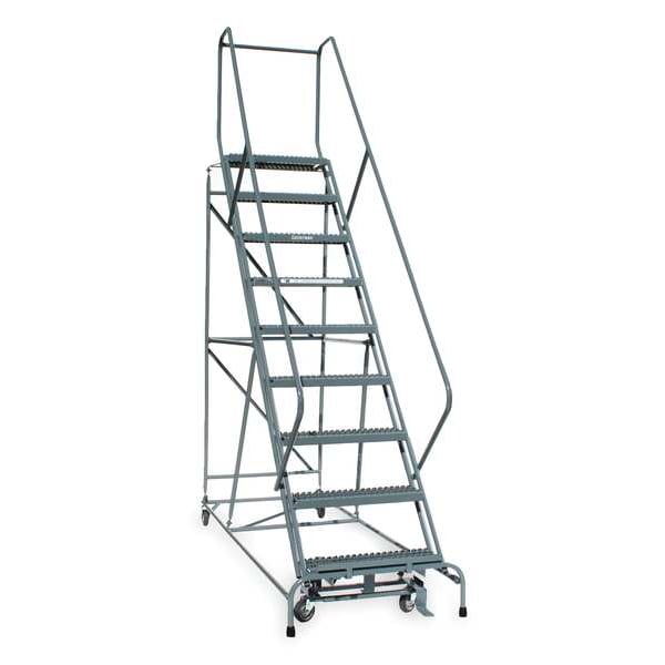 Rolling Ladder, Material Steel, Platform Height 7.5 ft, Handrails Included Yes, Handrail Height 2.5 ft, Overall Height 10 ft, Number of Steps 9, Assembled, Load Capacity 450 lb, Step Tread Serrated, Platform Depth 12 in, Platform Width 24 in, Bottom Width 32 in, Base Depth 88 in, Overall Width 32 in, Climbing Angle 50 Degrees , Step Depth 7 in, Step Width 24 in, Ladder Actuation Foot Activated Step Lock, Finish Powder Coated, Color Gray, Standards ANSI, OSHA Compliant, Rear Exit No
