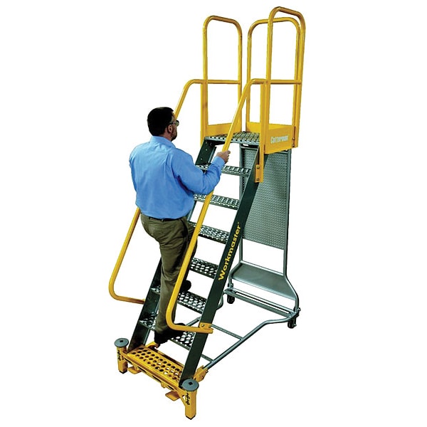 Rolling Ladder, Material Steel, Platform Height 6.7 ft, Handrails Included Yes, Handrail Height 3.5 ft, Overall Height 10.2 ft, Number of Steps 8, Unassembled, Load Capacity 1,000 lb, Step Tread Perforated, Platform Depth 24 in, Platform Width 24 in, Bottom Width 37 in, Base Depth 74 in, Overall Width 37 in, Climbing Angle 59 Degrees , Step Depth 7 in, Step Width 24 in, Ladder Actuation Foot Activated Step Lock, Finish Powder Coated, Color Gray, Yellow