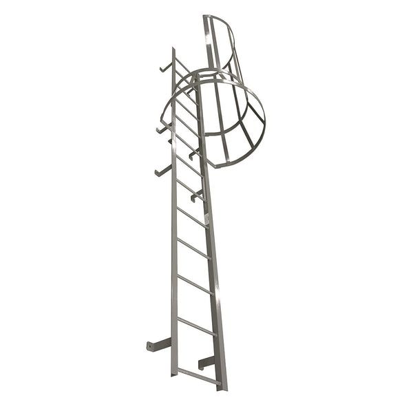 Fixed Ladder with Safety Cage, Walk-Thru Included No, Exit Left, Overall Height 13 ft, Overall Width 26 in, Material Steel, Load Capacity 300 lb, Number of Steps 14, Top Step Height 13 ft, Rung Dia. 3/4 in, Rung/Step Spacing 12 in, Step Width 16 in, Finish Powder Coated, Standards CAl/OSHA Compliant, Handrail Height Not Applicable