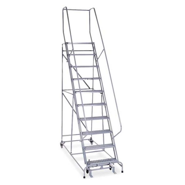 Rolling Ladder, Material Steel, Platform Height 8.3 ft, Handrails Included Yes, Handrail Height 2.5 ft, Overall Height 10.8 ft, Number of Steps 10, Assembled, Load Capacity 450 lb, Step Tread Expanded Metal, Platform Depth 10 in, Platform Width 24 in, Bottom Width 32 in, Base Depth 72 in, Overall Width 32 in, Climbing Angle 59 Degrees , Step Depth 7 in, Step Width 24 in, Ladder Actuation Foot Activated Step Lock, Finish Powder Coated, Color Gray, Standards ANSI, OSHA Compliant, Rear Exit No