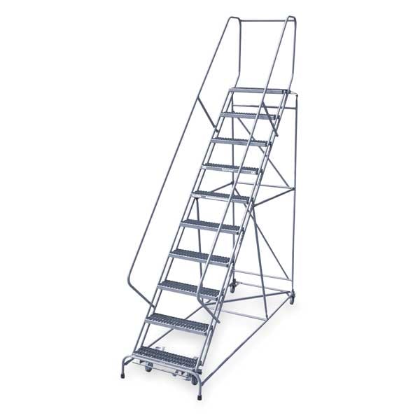 Rolling Ladder, Material Steel, Platform Height 8.3 ft, Handrails Included Yes, Handrail Height 2.5 ft, Overall Height 10.8 ft, Number of Steps 10, Assembled, Load Capacity 450 lb, Step Tread Serrated, Platform Depth 12 in, Platform Width 24 in, Bottom Width 32 in, Base Depth 97 in, Overall Width 32 in, Climbing Angle 50 Degrees , Step Depth 7 in, Step Width 24 in, Ladder Actuation Foot Activated Step Lock, Finish Powder Coated, Color Gray, Standards ANSI, OSHA Compliant, Rear Exit No