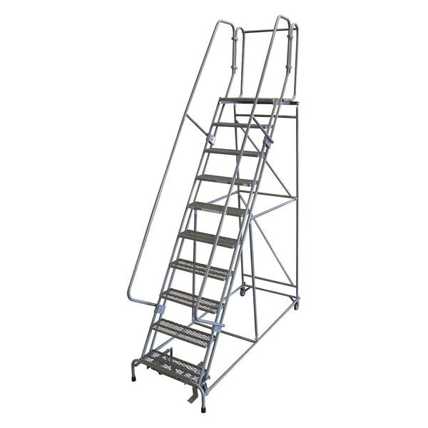 Rolling Ladder, Material Steel, Platform Height 8.3 ft, Handrails Included Yes, Handrail Height 2.5 ft, Overall Height 10.8 ft, Number of Steps 10, Unassembled, Load Capacity 450 lb, Step Tread Antislip Vinyl, Platform Depth 20 in, Platform Width 24 in, Bottom Width 32 in, Base Depth 84 in, Overall Width 32 in, Climbing Angle 59 Degrees , Step Depth 7 in, Step Width 24 in, Ladder Actuation Foot Activated Step Lock, Finish Powder Coated, Color Gray, Standards ANSI, OSHA Compliant