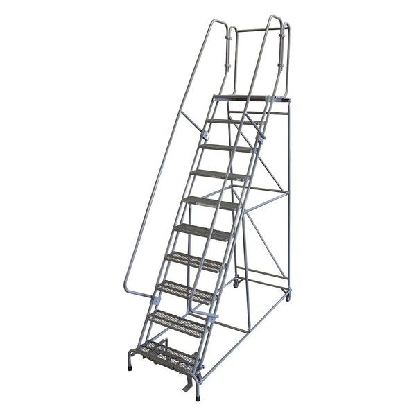 Rolling Ladder, Material Steel, Platform Height 8.3 ft, Handrails Included Yes, Handrail Height 2.5 ft, Overall Height 10.8 ft, Number of Steps 10, Unassembled, Load Capacity 450 lb, Step Tread Antislip Vinyl, Platform Depth 30 in, Platform Width 24 in, Bottom Width 32 in, Base Depth 94 in, Overall Width 32 in, Climbing Angle 59 Degrees , Step Depth 7 in, Step Width 24 in, Ladder Actuation Foot Activated Step Lock, Finish Powder Coated, Color Gray, Standards ANSI, OSHA Compliant