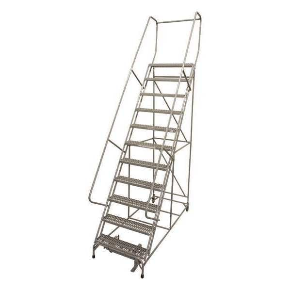 Rolling Ladder, Material Steel, Platform Height 9.2 ft, Handrails Included Yes, Handrail Height 2.5 ft, Overall Height 11.7 ft, Number of Steps 11, Assembled, Load Capacity 450 lb, Step Tread Serrated, Platform Depth 10 in, Platform Width 24 in, Bottom Width 32 in, Base Depth 140 in, Overall Width 32 in, Climbing Angle 59 Degrees , Step Depth 7 in, Step Width 24 in, Ladder Actuation Foot Activated Step Lock, Finish Powder Coated, Color Gray, Standards ANSI, OSHA Compliant, Rear Exit No
