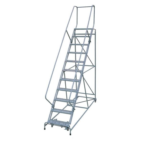 Rolling Ladder, Material Steel, Platform Height 9.2 ft, Handrails Included Yes, Handrail Height 2.5 ft, Overall Height 11.7 ft, Number of Steps 11, Unassembled, Load Capacity 450 lb, Step Tread Serrated, Platform Depth 24 in, Platform Width 24 in, Bottom Width 32 in, Base Depth 118 in, Overall Width 32 in, Climbing Angle 50 Degrees , Step Depth 7 in, Step Width 24 in, Ladder Actuation Foot Activated Step Lock, Finish Powder Coated, Color Gray, Standards ANSI, OSHA Compliant